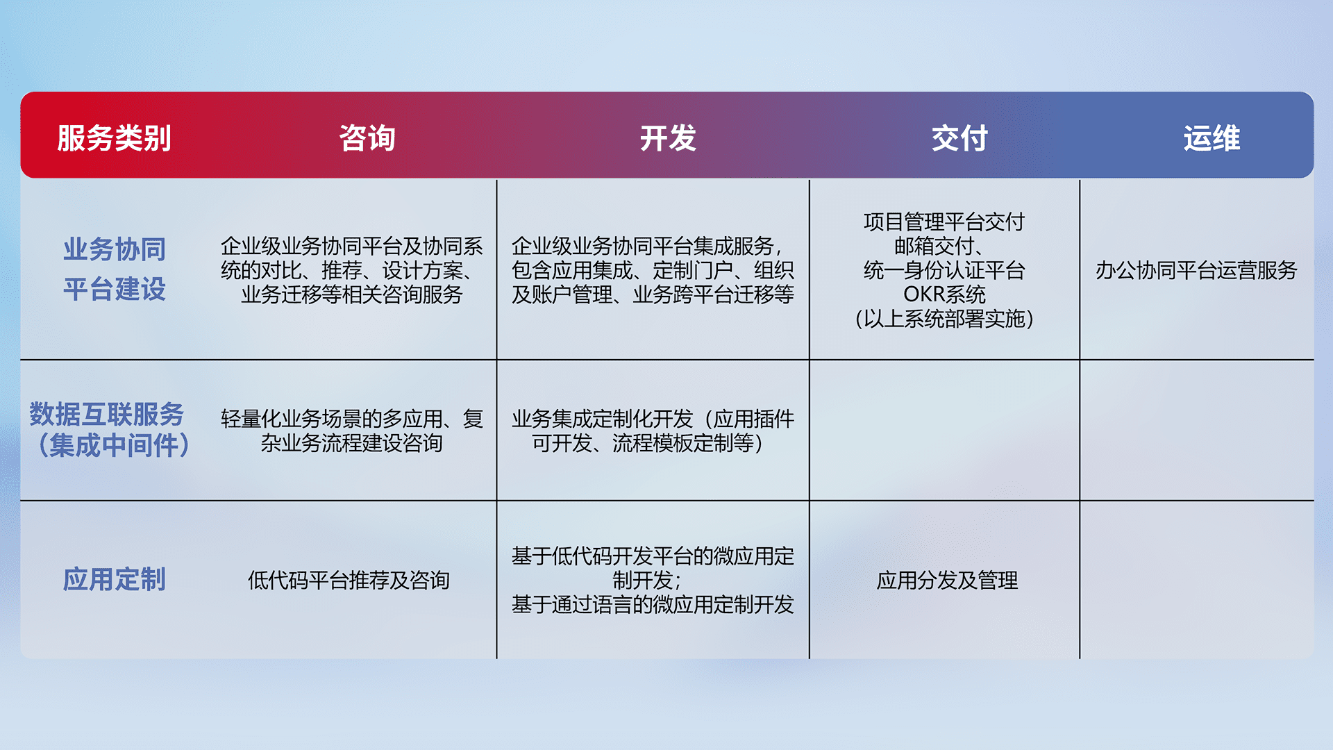 针对钉钉、、、企微、、IDaas等平台级产品提供产品的规划、、方案、、、交付、、定制化开发等服务,,,,实现如统一协同办公、、、、智能客户服务、、混合会议管理、、、、智能数据查询、、等业务场景,,,实现数字化转型。。。。