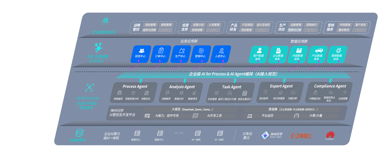 端到端的一站式AI工作空间深度融合了从企业战略规划到日常经营的全流程业务板块,,,,定向解决车企内部领域多、、、、部门多、、、、链条长、、场景碎片化等难题,,支持车企快速构建以AI为核心的生产力写作体系,,,实现任务执行与AI能力的无缝集成与交互