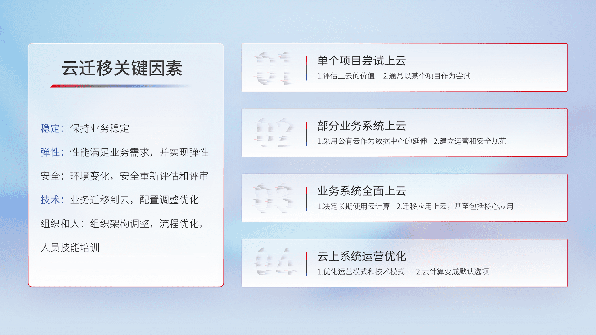 结合实际业务,,,从规划设计、、、、云平台选型、、、、云原生改造、、、、数据迁移、、、集成交付,,迁移全过程为客户识别最佳上云路径,,,,做好风险识别管理,,设计网络架构、、、身份权限、、安全审计合规、、、操作审计、、、日志审计、、、、监控告警策略、、多站点容灾设计等,,,,对云上基础设施进行整体规划,,,,提升IT治理水平,,,以满足弹性、、、、高可用、、、高性能的需求。。