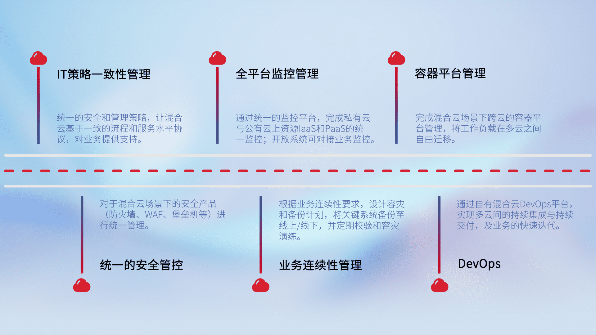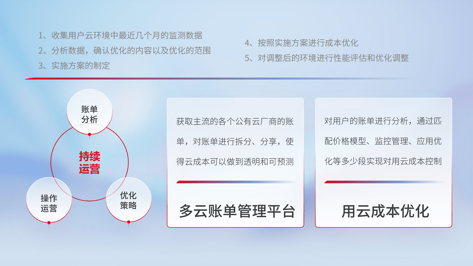 通过多云纳管,,,以统一的资源数据模型把客户的云资源进行抽象和封装,,进而实现对多云资源的统一操作,,,,保障云资源管理的可靠性、、、稳定性与可用性。。。。量身定制化运维内容,,配置、、、开发运维、、补丁管理、、、备份、、、、监控、、认证和访问管理、、、审计和日常巡检等,,,,保障在用云过程中的可靠度,,,稳定度以及高可用率。。。