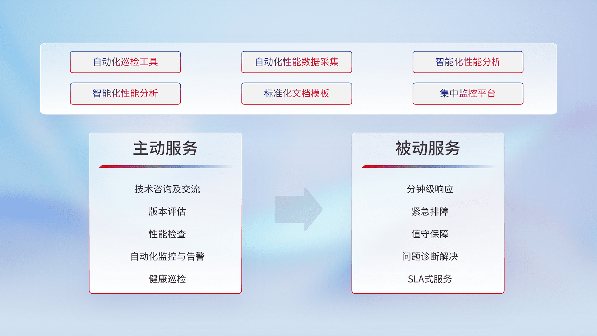 智能化工具和标准化文档,,,保障服务质量,,,提供主动服务(包含技术咨询、、、、版本评估、、、、性能检查、、、、自动化监控与告警、、健康巡检)和被动服务包含(分钟级响应、、、、紧急排障、、值守保障、、问题诊断解决、、SLA服务)。。